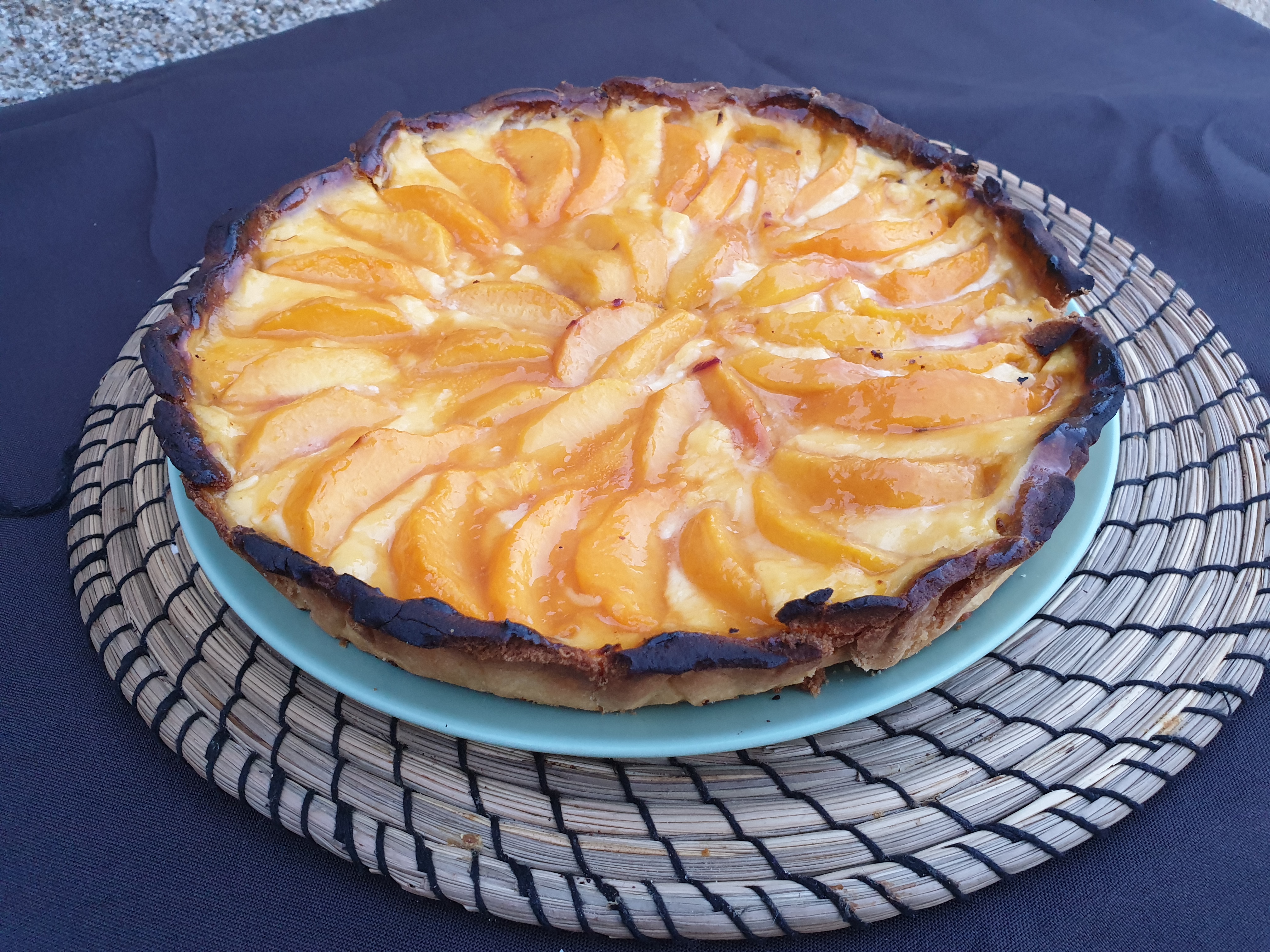 Quitamos la masa de la nevera, la estiramos encima de un papel sulfurizado la colocamos encima de un molde redondo, recortamos los bordes, encima de la masa ponemos la crema y la alisamos con una cuchara, ahora ponemos los melocotones encima de la crema haciendo un circulo para que quede bonita la tarta, espolvoreamos un poco de azúcar por encima de la fruta y horneamos 40 minutos a 180 grados.