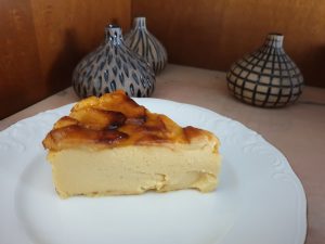 Pelamos la manzana que nos queda y la cortamos en gajos finos y la vamos colocando encima de la tarta, haciendo un circulo.