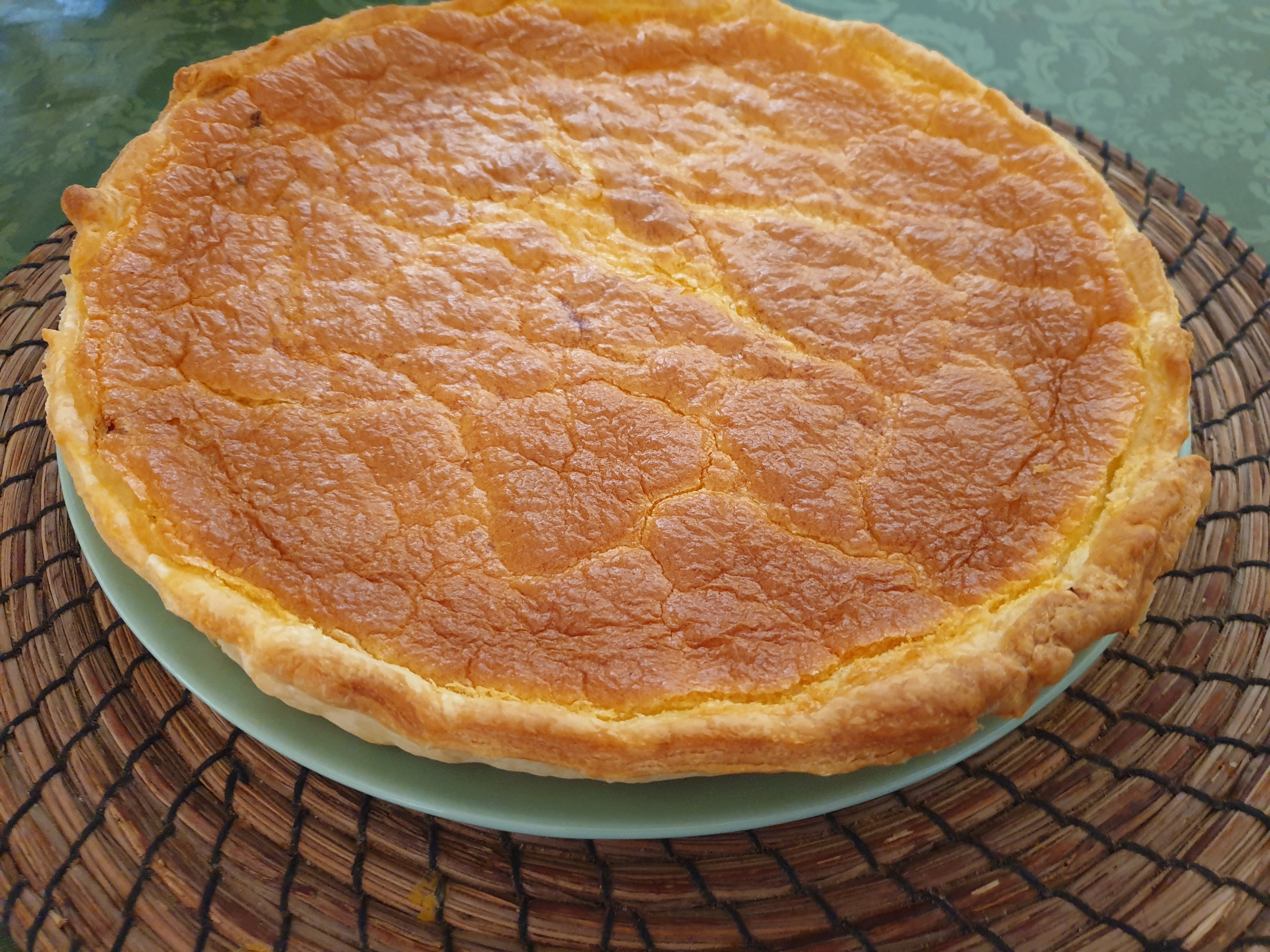 Volcar está mezcla encima de la masa de hojaldre y hornear a 180 grados 30 minutos .