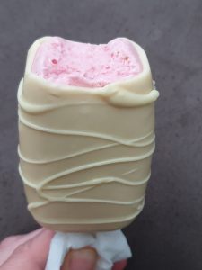 Al día siguiente hacemos el baño de chocolate blanco, derretimos el chocolate con el aceite , dejamos templar unos minutos y bañamos los helados de uno en uno y los vamos colocando encima de un papel de horno.