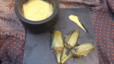 Escurrir las alcachofas y cortar por la mitad, servir con la salsa. Y listo.